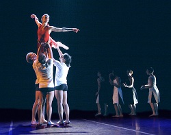 Kate Hutter – well what can I say?! This woman is equally as strong a dancer and performer as she is a choreographer. Of her three pieces, although I thoroughly enjoyed the duet Passion Plays (2005) danced by herself and Kevin Williamson, I was most enamored by Looking Back (2010). This was extraordinary! The entire piece faced upstage, and was guided by the dancers’ breaths, as there was no music. Looking Back referred to a step back in history as well as the anonymity and new identities created as the dancers performed the piece facing upstage. The large cast of men and women were adorned with long maroon skirts with their backs exposed to the audience. The skirts moved like another graceful appendage as their spacious movement traveled them downstage to upstage, and back again with mesmerizing patterns and structure to each phrase. Hutter’s remarkable staging and craftsmanship of phrasing could be a documented in a textbook of “how to choreograph a piece”. The dancers executed her vision with intuitive fluidity, control and depth.