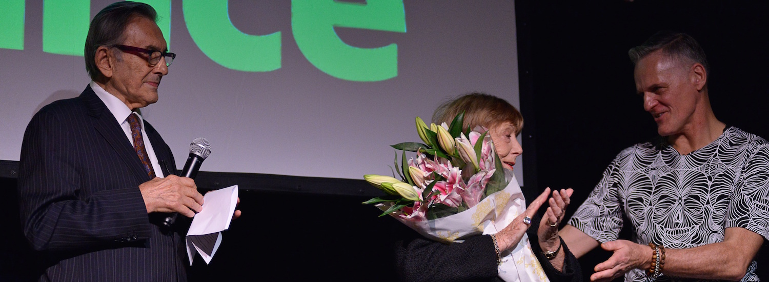 Mark DeGarmo presents Mireille Briane with flowers. Photo by Bill Massey.
