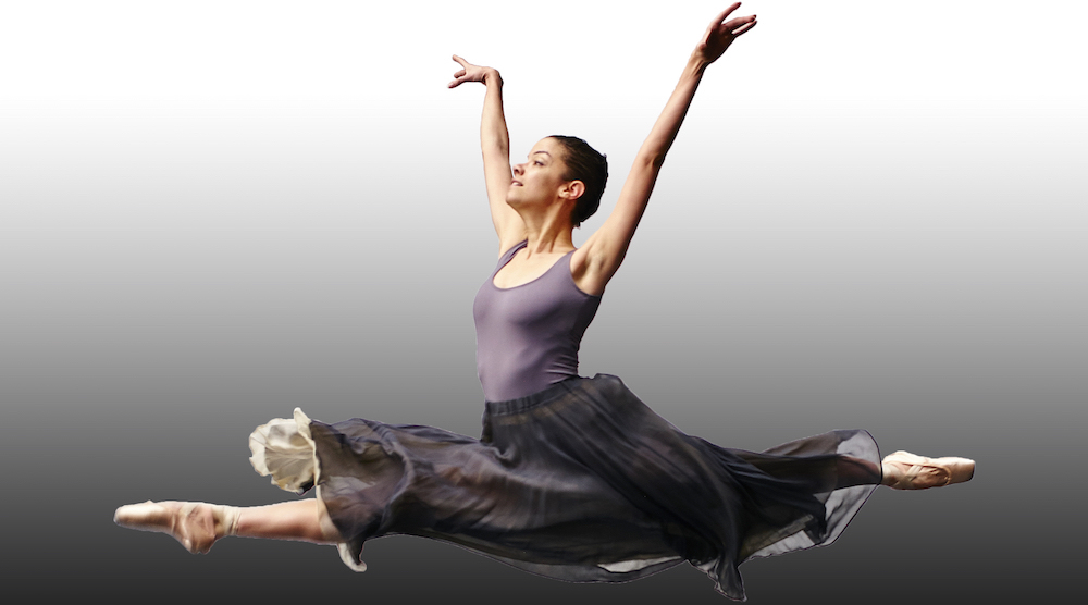 This shade gradually fades to white toward the top of the photo. A slight blur at the edges of her form evince her movement within the leap. This supports an overall sense of the directional energy in her body as she leaps. More than that, viewers can peer into her heart and soul engaged in her dancing – at a peak in this captivating leap.