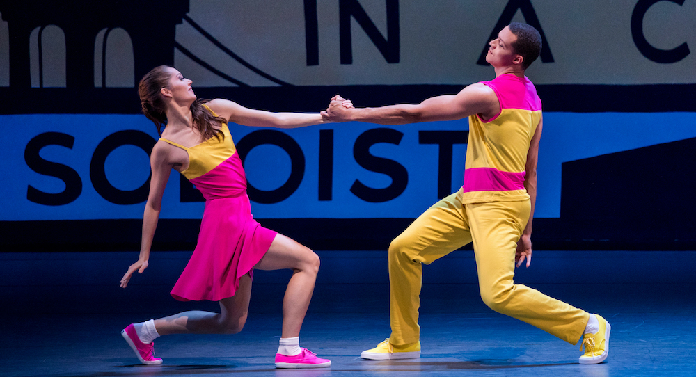 The last weekend of the Digital Spring Season featured 21st century choreographers. Easy by Justin Peck is an homage to Jerome Robbins, the choreographer explains in an introduction video. With the feel of a modernized Fancy Free, it’s a dramatized classical ballet with modern inflections and a pinch of attitude. The stage picture is compelling, but could have used more of the stage for visual clarity at times. The costumes of bright colored sections don’t read as authentic to me; why not slightly stylized street wear? On the other hand, its color palette — matching with the backdrop — is somehow both enticing and soothing. Dancers expertly bring across easy suave and rock-solid technical work. Memorable motifs include a wave and gaze to the audience in a long arabesque, and intricate footwork leading into a leg extended to the side — long and low.