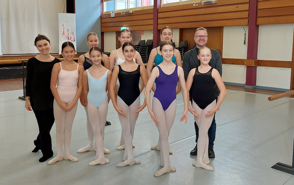 Tim-Arthur-with-students-from-the-Teresa-Johnson-Ballet-School-with-their-teacher-Antonia Share Tweet Share