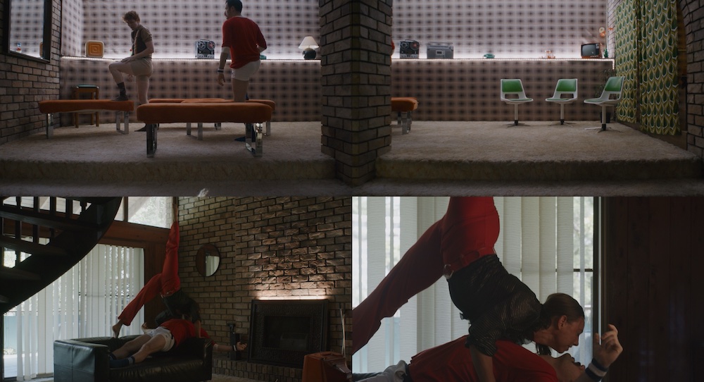 Even more edginess enters later in the film – through an electronica score and sassy, sultry presence from (and interactions between) personas on screen. It remains satisfyingly rhythmic and kinetically integrated through these bold, unconventional choices. Part of that boldness is interior design straight out of the Brady Bunch — 1970s avocado and earth tones with exposed brick, as they play Twister and sparklers illuminate a fancy cake. A nostalgia at hand interfaces with something much fresher and more innovative.