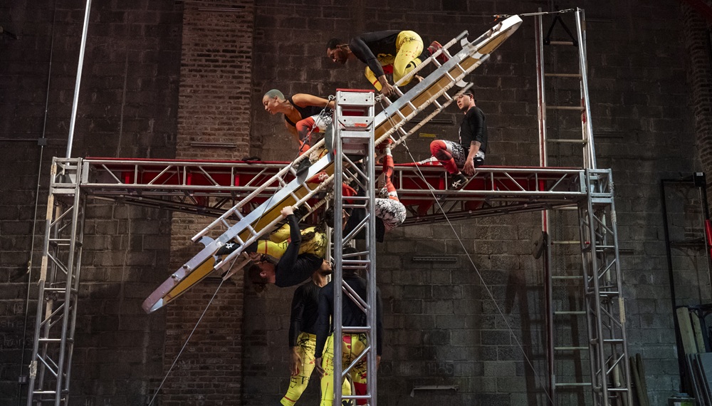 In “AIR SPLINTER,” Action Heroes cascade in surprising, rhythmic bursts, while in “MAVERICK SURF,” performers endure the ever-increasing intensity of a 100-foot wave simulation that turns motion and gravity into their greatest adversaries. The performance also features the return of some of STREB’s favorite Action Events where bodies and physics collide — from the split-second ducking and dodging of “CHAOS MASS” to the precarious balance of “MUSIC BOX,” the precise geometry of “REBAR SOLO,” and the tight squeeze of “SQUIRM.” INTO THIN AIR negotiates the exhilaration of soaring to new heights while confronting the reality of the crash.