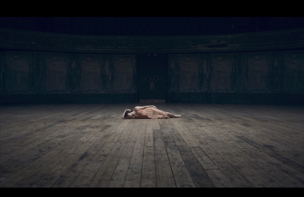 The piano score rises along with a spotlight coming up on Seymour. She wears a draping dress of light fabric, and the space is Spartan: it’s just her, the movement, and music. She slowly takes to her feet, her hands dexterously gesturing through her kinesphere. Her momentum builds as the score also does, to have her soon waltzing, stepping, and reaching through the open space all around her – the camera panning out to catch all of this ambulation.